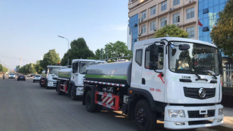 灑水車前裝有鴨形噴嘴或圓頭沖嘴,后面裝有圓柱開灑水噴嘴或蓮蓬頭噴嘴,后部有一工作平臺(tái),裝配有水炮。后部還可裝8個(gè)噴嘴(選裝)。