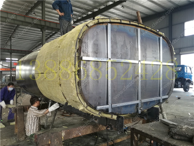 保溫運(yùn)熱水車的裝水容器為帶有保溫層的方形或橢圓形罐體,罐體總成結(jié)構(gòu)類似于一般灑水車的罐體,罐體和封頭采用優(yōu)質(zhì)碳鋼板或不銹鋼板,罐體內(nèi)部設(shè)置防浪 板,減少內(nèi) 部熱水在運(yùn)動(dòng)中對罐體的沖擊。罐體上部人口蓋是方便直接接水或人員進(jìn)出維修,清掃的裝置,人口蓋上部留有通氣孔,裝卸熱水時(shí)起到 罐體內(nèi)外氣體交流的作用。保溫層總成是保溫運(yùn)水車的重要部件之一,其保溫原理是利用保溫材料的保溫特性使得罐體內(nèi)的熱水溫度不向外傳導(dǎo),外部空氣無法接入。