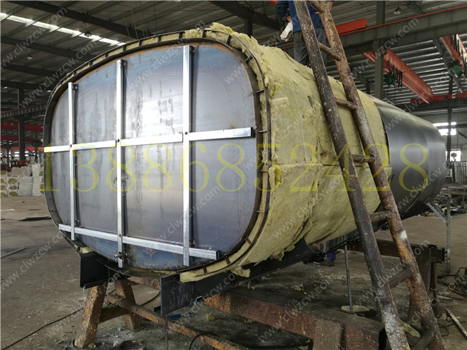保溫層在制作上主要是在罐體外部先焊接一個(gè)支撐骨架,其厚度一般為100mm,然后再用保溫材料把骨架填充滿。在保溫材料的選擇上我們一般考慮導(dǎo)熱系數(shù)小,耐高溫,質(zhì)量輕,吸聲性能好,絕緣性和化學(xué)穩(wěn)定性好的硬質(zhì)聚氨酷泡沫塑料或巖棉。然后需要對(duì)填充的保溫材料進(jìn)行修正,最后在骨架上撞上蒙板,蒙板一般使用厚度為lmm的冷軋板。