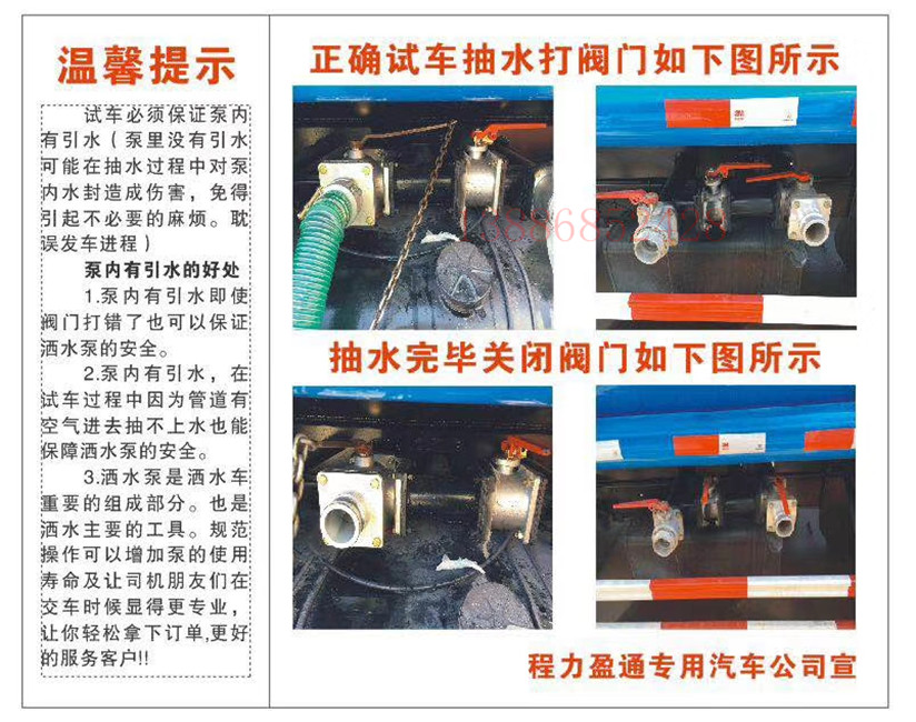 灑水車車載水泵的正常使用和常規(guī)保養(yǎng),隨著國(guó)內(nèi)經(jīng)濟(jì)的高速發(fā)展,國(guó)家對(duì)環(huán)保越來越重視,灑水車已經(jīng)普及到村鎮(zhèn)甚至各個(gè)廠和小區(qū),但是如何正確使用灑水車,好多司機(jī)朋友還沒有正真了解。為了避免因一些小問題而影響灑水效果,灑水車車載水泵的正常使用和常規(guī)保養(yǎng),湖北盈通專汽友情提示廣大司機(jī)朋友,注意以下問題,敬請(qǐng)惠存!!!