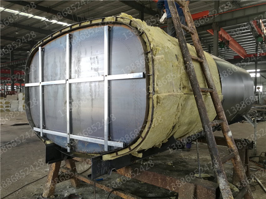 3. 保層溫的制作是在水罐外部另外焊接10mm厚的支撐骨架,然后用保溫材料將骨架內(nèi)部填充滿,**在骨架外蒙上一層外皮。 保溫層外表鐵皮采用8mm厚高強(qiáng)度耐磨板,可選擇使用不銹鋼分鏡面8K或磨砂板