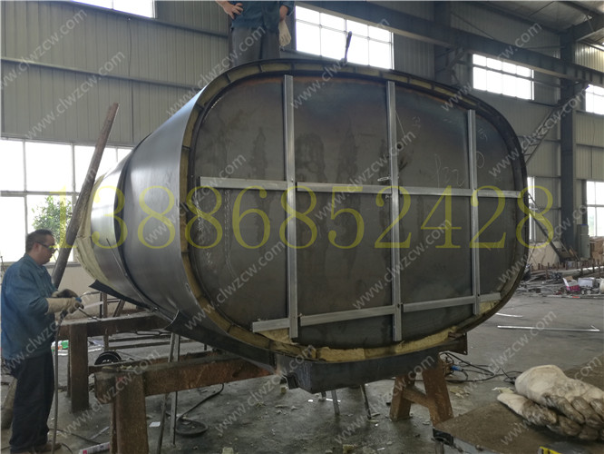 采用國(guó)標(biāo)5.0碳鋼板壓制,直體合焊,罐口采用壓閥關(guān)合,封頭開(kāi)口留有連通器(可觀察內(nèi)部水位),罐 體倉(cāng)內(nèi)1.5米一道隔板,具有防波防蕩作用。