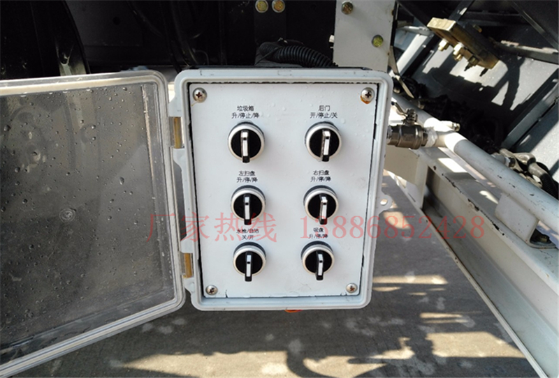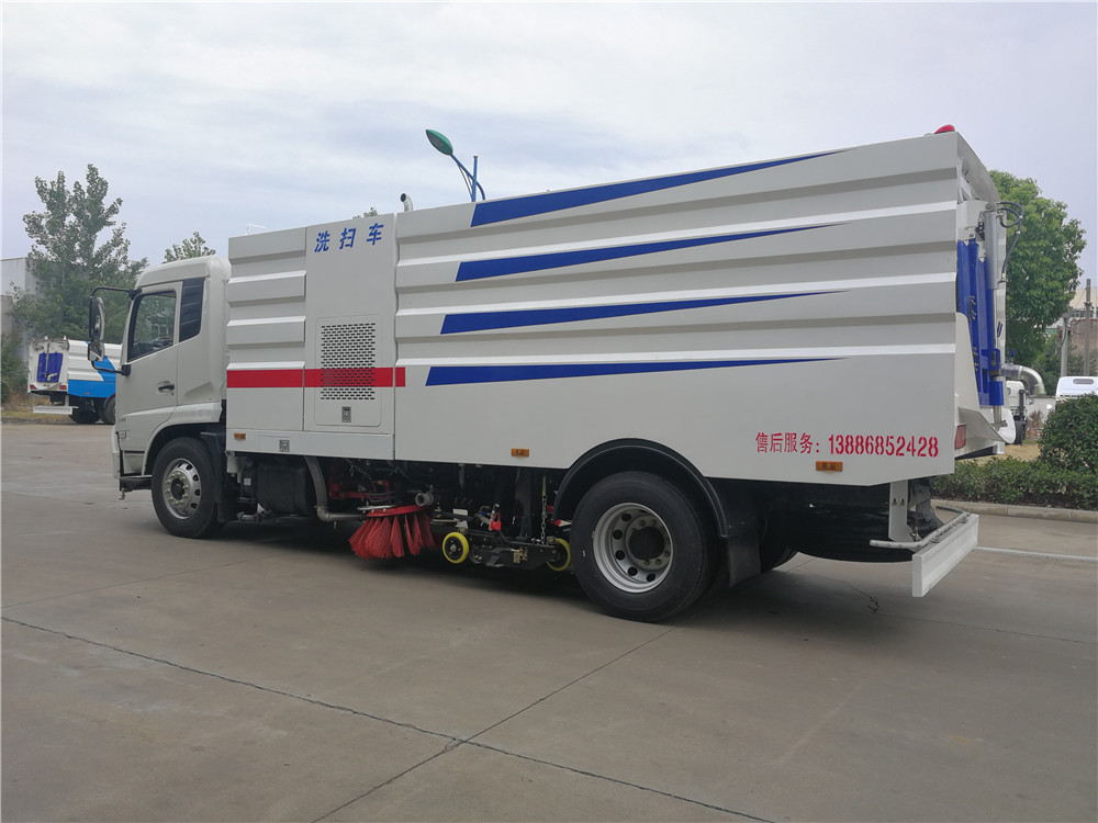 該洗掃車采用東風(fēng)多利卡國六二類底盤改裝,加裝副發(fā)動機(jī)、風(fēng)機(jī)、清水箱、垃圾箱、左右立掃、掃盤降塵系統(tǒng)、左右高壓側(cè)噴高、吸盤內(nèi)置高壓主噴桿、氣動系統(tǒng)、液壓系統(tǒng)、專用裝置電控系統(tǒng)和副車架等改裝而成。