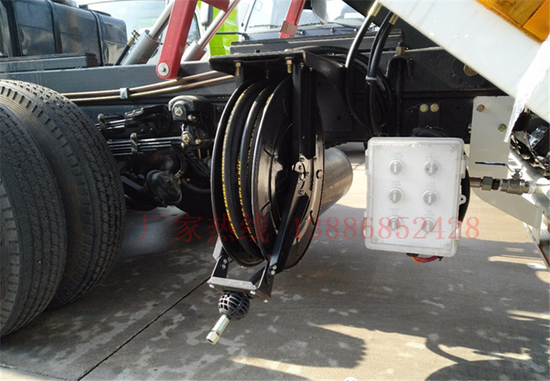 洗掃車右后側(cè)裝有機(jī)械式自動卷繞沖洗卷盤,配 17m 高壓軟管,可用于清行車身和其 他需要清洗的地方。手持不銹鋼噴槍配快速接 頭,能方便地與沖洗卷盤連接或脫開,產(chǎn)生的 高壓水流可輕松沖去路邊小廣告。