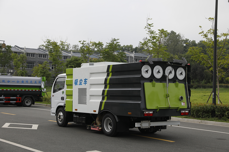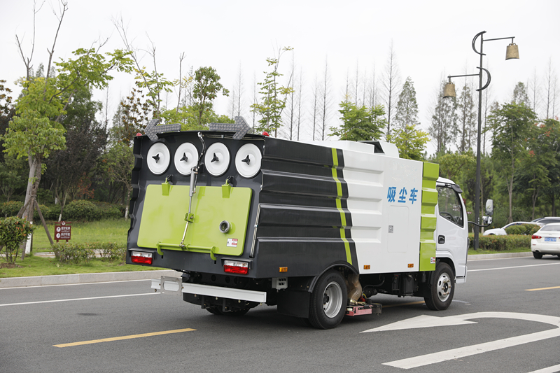 吸塵車垃圾箱上端裝有過濾系統(tǒng)和除塵