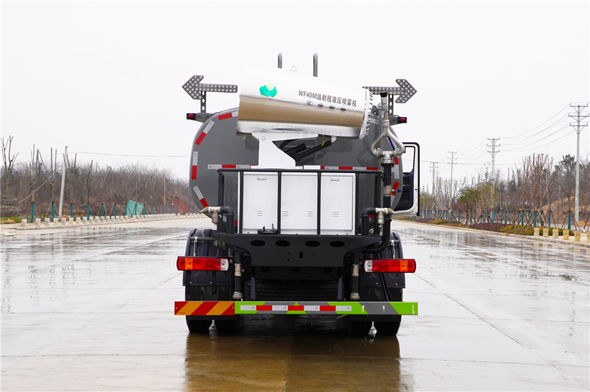 該車主要用于城鄉(xiāng)園林綠化,路面噴灑;主要裝置為罐體及噴灑裝置.罐體總容量:10.6立方米;罐體有效容積10.1立方米;介質:丙酮水溶液,密度950千克/立方米,罐體外形尺寸(長×長軸×短軸)(mm):4600×2300×1450.側防護采用電池護罩代替,材料為Q235碳鋼,螺栓連接;后防護材料為:Q235碳鋼,連接方式為:螺栓連接,后部防護截面尺寸(mm):120×50,后部防護離地高度(mm):490;ABS型號/生產企業(yè):ABS-E/采埃孚商用車系統(tǒng)(青島)有限公司;電池種類:磷酸鐵鋰電池,儲能裝置單體生產企業(yè):寧德時代新能源科技股份有限公司,儲能裝置總成生產企業(yè):寧德時代新能源科技股份有限公司;電機型號/生產企業(yè):TZ375XSSF-SZF611/陜西法士特齒輪有限責任公司,額定功率:105kW,峰值功率:175kW.選裝前部電子水炮樣式,選裝前部不帶電子水炮,該狀態(tài)下車長為8100mm;當前部安裝電子水炮時,車長為8600mm,車輛前伸500mm.后部箭頭指示燈僅在車輛作業(yè)時開啟.選裝車輛前部鴨嘴裝置. |