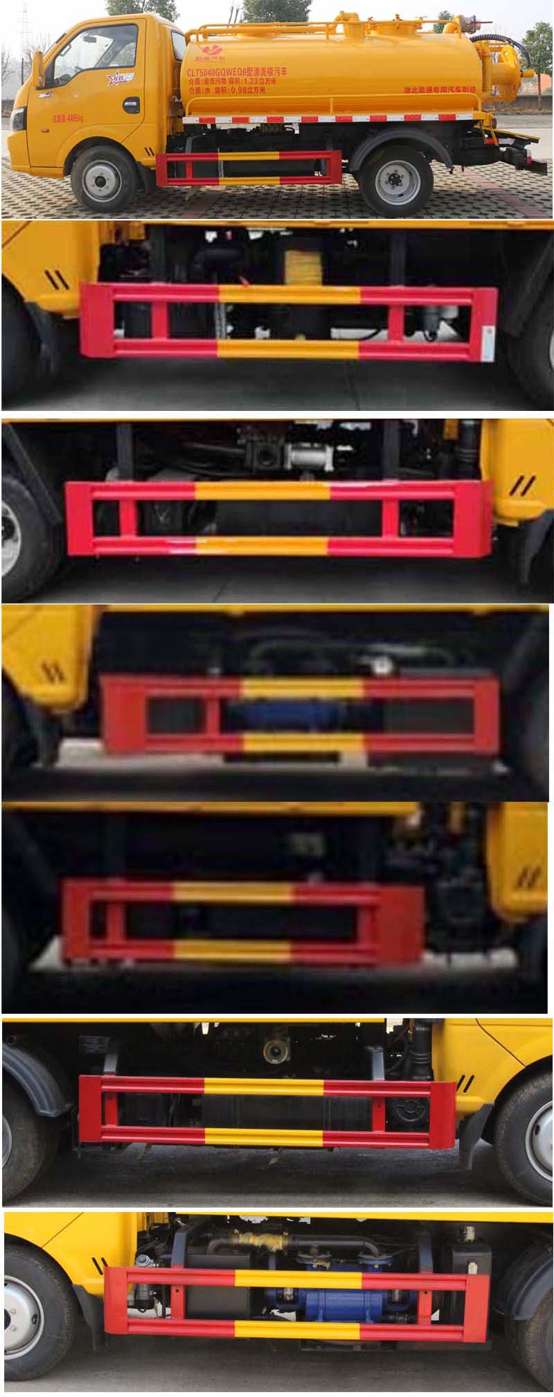 該車用于下水道排污及疏通,專用裝置:罐體及清洗吸污裝置;罐體外形尺寸(長×長軸×短軸)(mm):2800×1550×1000,罐體前段為清水罐(長1590mm,其中前端下部1100mm用于安裝高壓泵);后段為污水罐(長1210mm);污水罐總?cè)萘?/span>:1.29立方米,污水罐有效容積:1.23立方米,介質(zhì):液態(tài)污物,密度800千克/立方米;清水罐總?cè)萘?/span>:1.03立方米,清水罐有效容積:0.98立方米,介質(zhì):水,密度1000千克/立方米,清水罐和污水罐為獨立罐體,清洗功能時用清水罐,吸污功能時用污水罐,污水罐和清水罐不可同時滿載,兩罐不能同時滿載使用;ABS型號/廠家:APG3550500A/浙江亞太機電股份有限公司;側(cè)、后防護材料均為:Q235碳鋼,連接方式均為:螺栓連接,后部防護截面尺寸(mm):100×50,后部防護離地高度(mm):360.僅采用底盤2800mm軸距改裝.選裝油箱及電瓶位置。隨底盤選裝駕駛室。 |